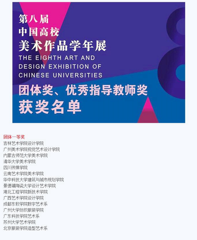 本网讯 (艺术系)日前,第八届中国高校美术作品学年展获奖作者及作品名单公布。我院艺术系获团体一等奖,艺术系15位学子获优秀奖,39位学子获入选奖,教师张阳阳、张力、庞赛男获优秀指导教师奖。