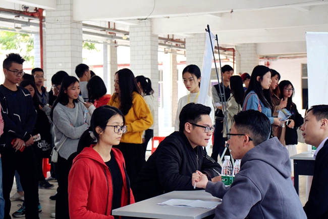 此次招聘会共有60家企事业单位为我院学生提供了300个兼职岗位,覆盖了金融、教育、电子、餐饮、设计等行业。其中包括多家大型企业:中国人寿保险股份有限公司、中域电信连锁集团股份有限公司、东莞肯德基有限公司等。招聘会现场气氛热烈,秩序井然。到场寻找兼职岗位的同学积极与招聘单位沟通,主动了解用人单位的情况。据统计,现场应聘的1600余名同学中有813名同学当场与企业达成初步的兼职协议。