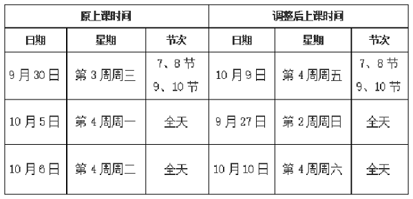 为避免出行拥堵,依据本学期校历,经学校党政联席会议决定,国庆节、中秋节前后放假、调课安排如下: