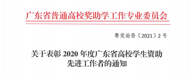 本网讯(学生处)近日,广东省普通高校奖助学工作专业委员会公布《关于表彰2020年度广东省高校学生资助先进工作者的通知》,我校管理学院辅导员陈宝生老师和学生处李绣明老师分别获得2020年度广东省高校学生资助 “先进工作者”称号。
