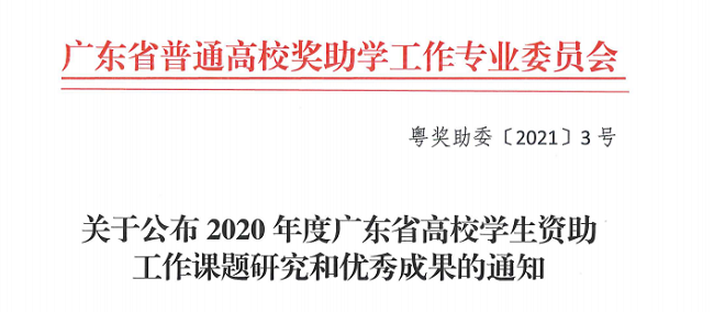 同时,广东省普通高校奖助学工作专业委员会发布《关于公布2020年度广东省高校学生资助工作课题研究和优秀成果的通知》,决定对全省61项课题研究和优秀成果予以结项和表彰。我校艺术学院院长助理邵明福负责《社会主义核心价值观教育融入资助育人工作探究》、学生处李绣明负责《高校学生资助工作育人效能研究》两项资助工作课题顺利结项并获得三等奖。