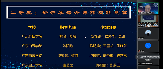广东省经济学综合博弈实验大赛闭幕式时间为6月6日19:30-20;30,出席闭幕式的嘉宾有:广东省经济学教指委主任暨南大学校长宋建中教授、深圳北理莫斯科大学校长和北京理工大学副校长李和章教授、俄罗斯联邦前副总理和深圳北理莫斯科大学第一副校长谢尔盖.米哈伊洛维奇.沙赫赖教授等重要领导,另外,我校财经学院金融教研室主任黎晓老师作为指导老师代表就指导比赛分享了经验和心得。