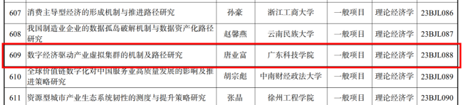 本网讯(党委办公室)9月22日,全国哲学社会科学工作办公室公布了2023年国家社科基金年度项目和青年项目立项名单。我校管理学院唐业富老师主持的《数字经济驱动产业虚拟集群的机制及路径研究》获批立项。据统计,本年度国家社科基金年度项目和青年项目共有4790项,广东省立项课题233项,其中全国民办高校立项数为23项。我校是2023年广东省唯一一所获得立项的民办高校。