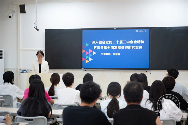 10月15日上午,省政府督导专员、校党委书记吴念香为24级艺科本科1班的同学们讲授新学期“思政第一课”。吴书记紧密围绕“深入领会党的二十届三中全会精神 五育并举全面发展勇担时代重任”这一主题,以深入学习宣讲党的二十届三中全会精神为主线,从广科五育并举助力学生成才、全面发展勇担时代重任等部分讲解。