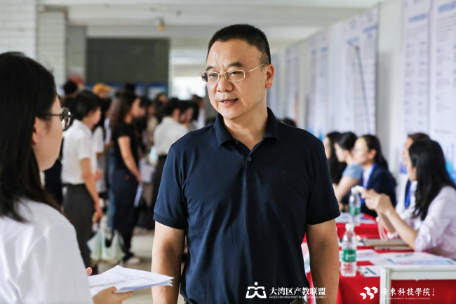 学校副校长陈标新在双选会现场与用人单位代表就深化校企合作,推动教育链、人才链与产业链、创新链有机衔接进行交流。他还与求职学生交谈,了解学生求职与实习意向。