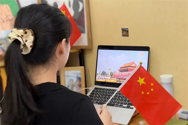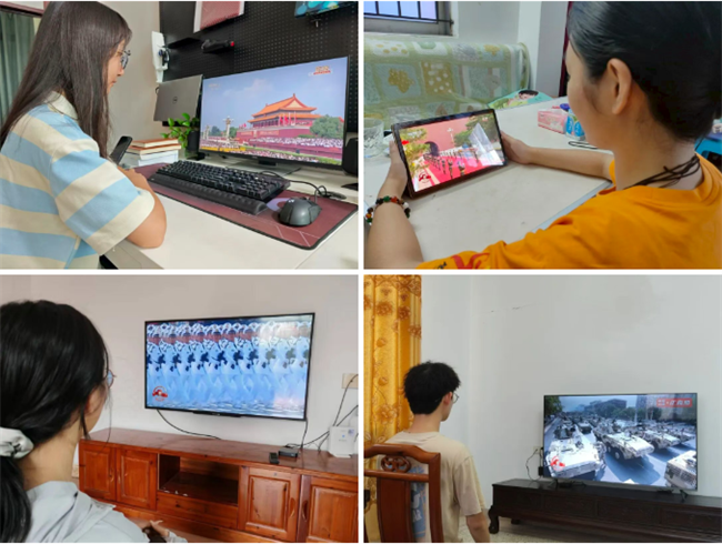 而未返校的学生们,也早早地守候在屏幕前,通过电脑、电视、手机等多种形式收看阅兵直播,万千广科学子的目光因祖国而聚焦。大家热烈地讨论着阅兵仪式的精彩瞬间,分享着自己的感动与自豪,表达着青年一代对祖国母亲的热爱。