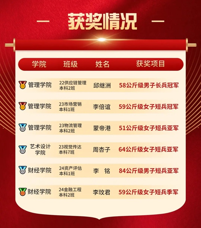 荣耀背后,是队员们无数个清晨与黄昏的刻苦训练,他们用汗水和毅力在赛场上展现广科学子的风采与体育精神;老将坚守与新秀崛起,共同书写着我校武术长短兵队的辉煌。他们用实际行动证明:只要心怀信念,勇于拼搏,就能在赛场上创造奇迹。荣誉属于过去,奋斗仍在继续,期待我校武术长短兵队在未来的赛事中再创佳绩,为校争光!