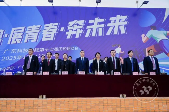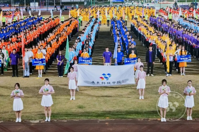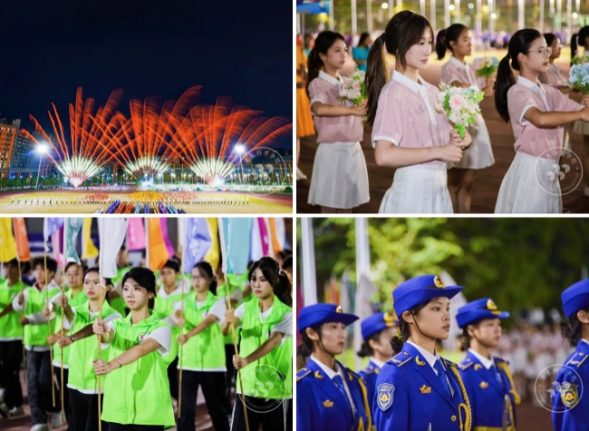 学校党委书记吴念香宣布广东科技学院2025年第十七届田径运动会开幕。夜幕之下,烟花绽放,闪烁的光影伴着欢呼声,为运动健儿们注入满满能量,愿他们在赛场挥洒激情、勇夺佳绩!