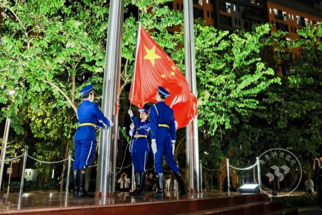 各方阵入场完毕,全体起立,面向国旗,奏唱国歌,五星红旗迎着微风冉冉升起,高高飘扬在田径场上空。