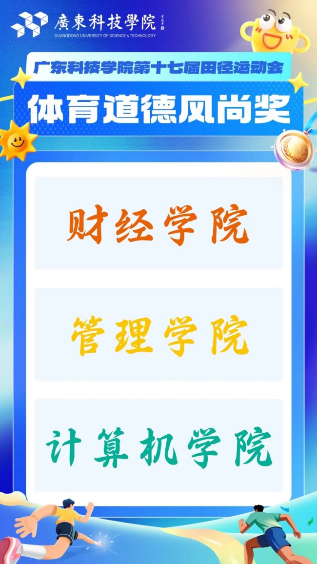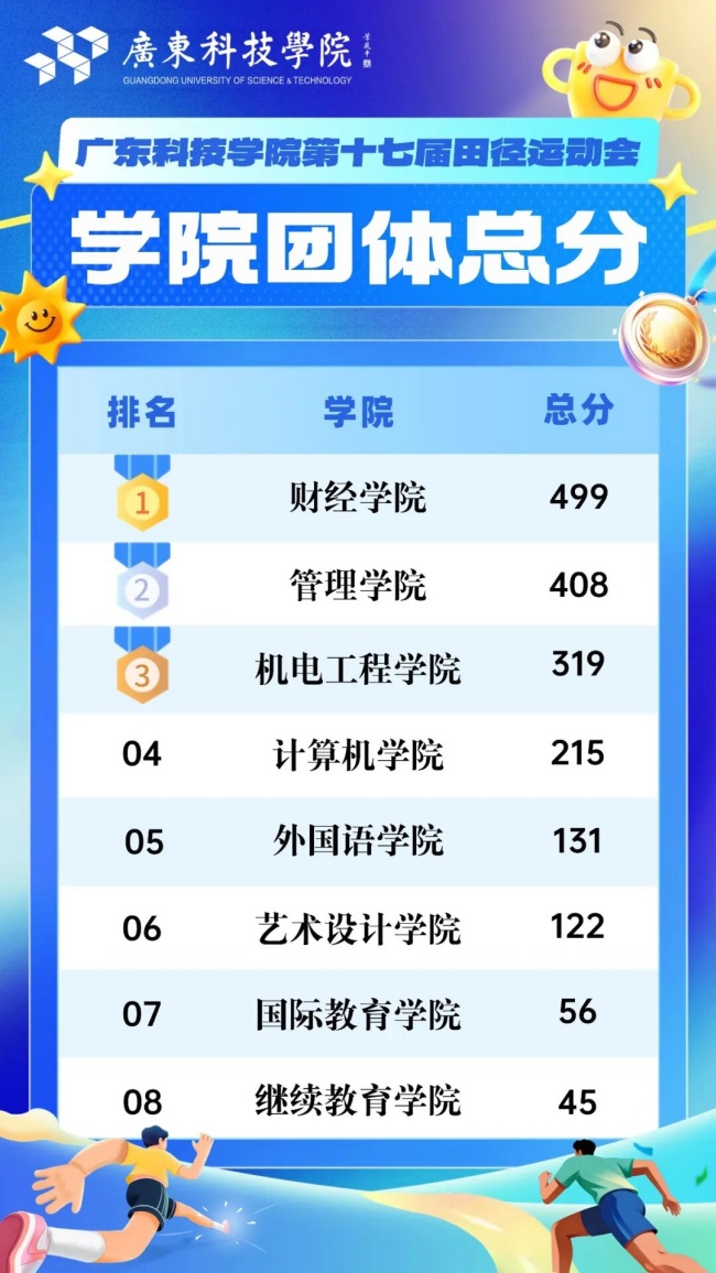 经过全体运动员两天半的奋勇角逐和裁判员们的公正执裁,最终财经学院以499分的优异成绩斩获团体总分冠军,管理学院斩获团体总分亚军,机电工程学院斩获团体总分季军。财经学院、管理学院、计算机学院获得体育道德风尚奖。