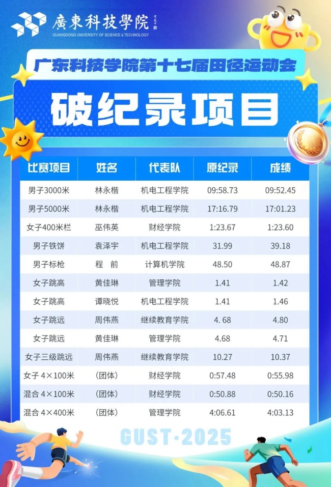 本届赛事共吸引579名运动员参与38个项目角逐,441人次荣获奖项,其中23人次打破11项运动会纪录,整体竞技水平显著提升。机电工程学院谭晓悦以1.46米、管理学院黄佳琳以1.42米双双刷新女子跳高的原纪录;机电工程学院林永楷同时打破男子3000米、5000米的原纪录;特别是财经学院女子4×100接力队以55秒98打破封尘9年的记录。