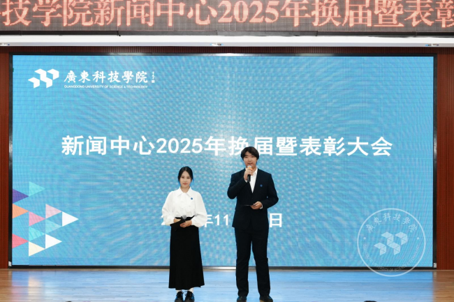 本网讯(新闻中心)11月19日,我校新闻中心2025年换届暨表彰大会在南城校区图书馆七楼报告厅召开。党委办公室副主任、品牌中心副主任张静静,品牌中心科长、新闻中心副主任余珊,品牌中心副科长、新闻中心指导老师徐婵,品牌中心干事、新闻中心指导老师林锦珊、叶雪妮,品牌中心实习老师张涵韵以及两校区新闻中心成员参加会议。会议由新闻中心杨夕、张逸然主持。