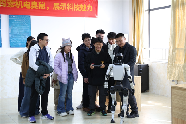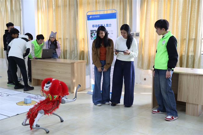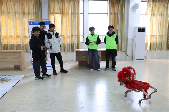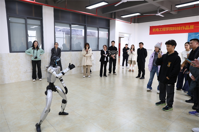 紧接着,研学团移步至机器人产业学院,精彩纷呈的科技作品展示随即展开。15名志愿者化身“小小讲解员”,逐一演示各类机器人原型、智能控制装置等学生科创成果,生动讲解作品的设计理念、技术亮点及应用前景,让研学团师生直观感受科技创新的无限可能与青年学子的创造活力。