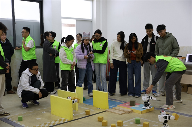 科技作品展示后,机器人操作比赛正式启动。在培训员的耐心指导下,研学团学生分组参与实操体验,大家从熟悉设备操作流程、理解操控逻辑,到尝试下达简单运行指令,在动手实践中探索机器人技术的奥秘,沉浸式感受工程实践的乐趣与挑战,现场互动热烈。