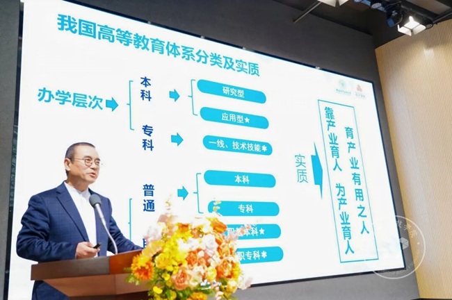 佛山大学设计学院党委书记范劲松教授从理论构建角度,分享了《高层次应用型人才精细化分类与胜任力图谱构建》。他指出现行“技能型—技术型—创新型”三分法在人才定位上的模糊性,创新性地提出了“技能应用型(表现与执行)、技术应用型(实现与优化)、创新应用型(定义与规划)”的三层分类模型,并借助“画图的手法”、“落地的身法”、“指路的脑法”等隐喻,形象阐述了三者核心职能与思维模式的差异。他进一步引入“德雷福斯技能习得模型”、“T型/π型人才”理论及“冰山模型”,论证了对每类人才进行内部能级细分、横向职能区分及深层特质培养的必要性,为院校在专本协同中明确各自培养定位、实现差异化衔接与精准育人提供了清晰的理论框架和操作思路。