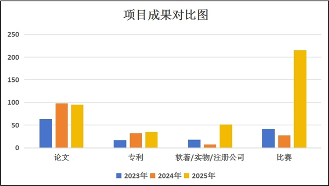 2025年度学校共申报了212个大创项目,较上一年度增长了15.2%,经评审最终立项102项,包括国家级10项、拟推荐省级32项、校级60项,其中“数智乡村:AI双引擎驱动的智慧乡村服务生态构建”等2个项目为省级重点支持领域项目。2025年大创项目结题率为92%,首次突破90%,为近三年最高。通过大创项目产出95篇学生论文、35项学生专利、比赛215项,包括软著/实物/注册公司等51项,成果数量与质量实现双提升。