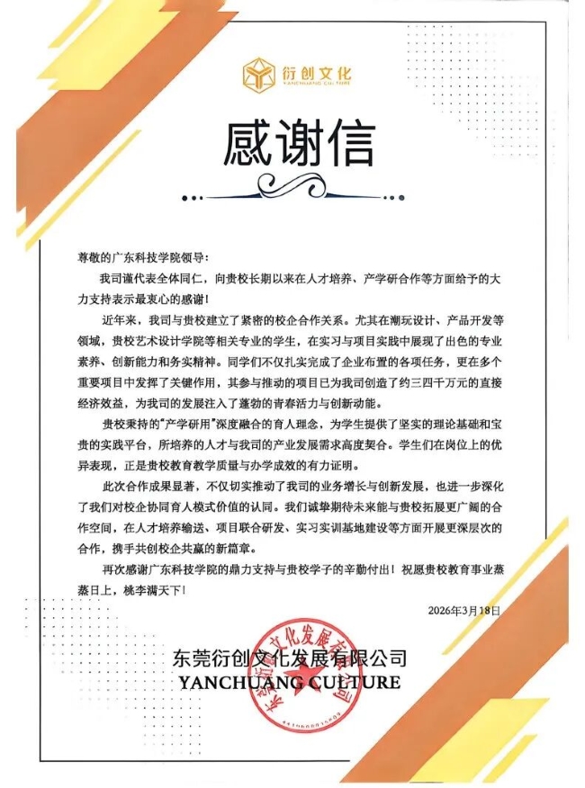 一封来自东莞衍创文化发展有限公司的《感谢信》,成为校政行企协同育人成效的生动注脚。在校企合作中,潮创产业学院学子深入企业生产运营一线,全程参与潮玩设计、产品开发、项目运营等核心工作,其中陈智、周雪苑等学子还参与了《MISYA怪诞陈列馆》《露露灵物语》《露露灵2代万物初醒》等知名 IP 项目辅助工作,凭借出色的专业素养、卓越的创新能力和踏实的务实精神,高标准完成各项工作任务。