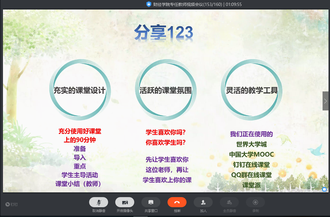 为了进一步完善教师线上教学工作,提高学生线上学习效率,2020年3月11日下午3点,财经学院利用钉钉视频的方式召开了专任教师会议。会上樊贵玲、王鑫娟、邱瑾、李苏亮四位老师分享他们线上教学的经验。