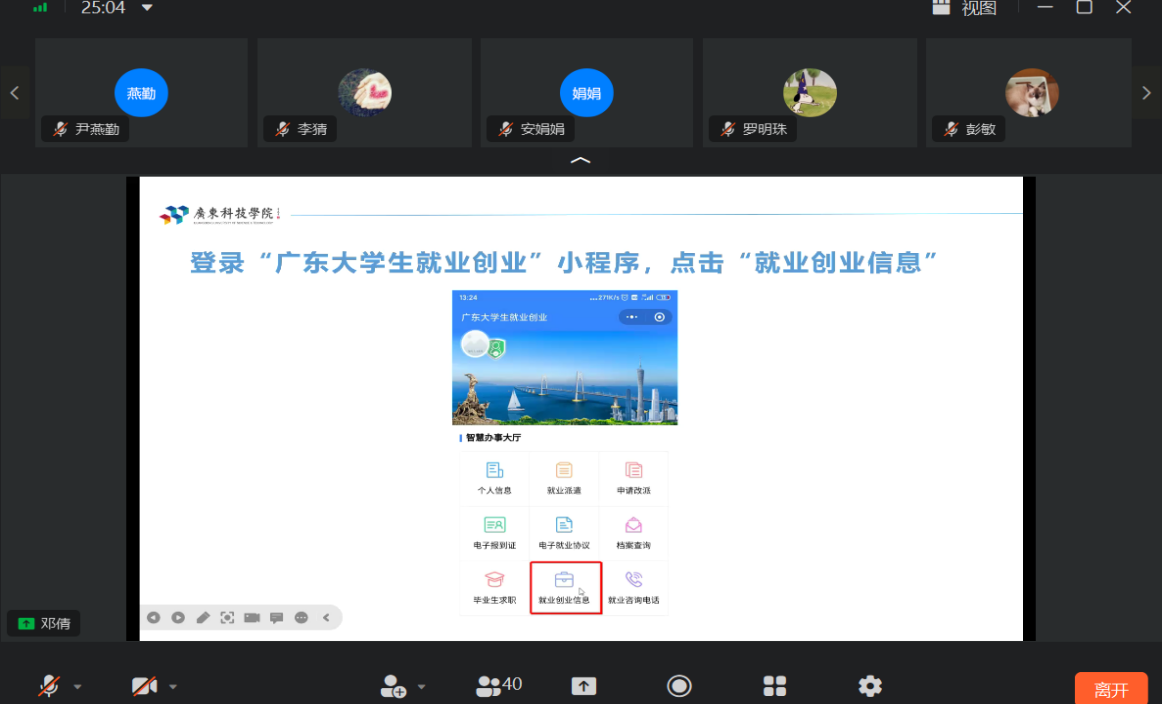 邓倩老师详细介绍了毕业生就业创业信息系统,强调毕业实习的指导老师需要做好督促应届毕业生按时完成就业创业信息的填报工作。邓倩老师演示了就业创业信息系统使用过程,展示了就业创业信息系统学生上报信息的流程及上报材料要求,说明了学校审核就业创业上报的流程,并针对常见的就业创业信息系统使用问题进行答疑解惑。