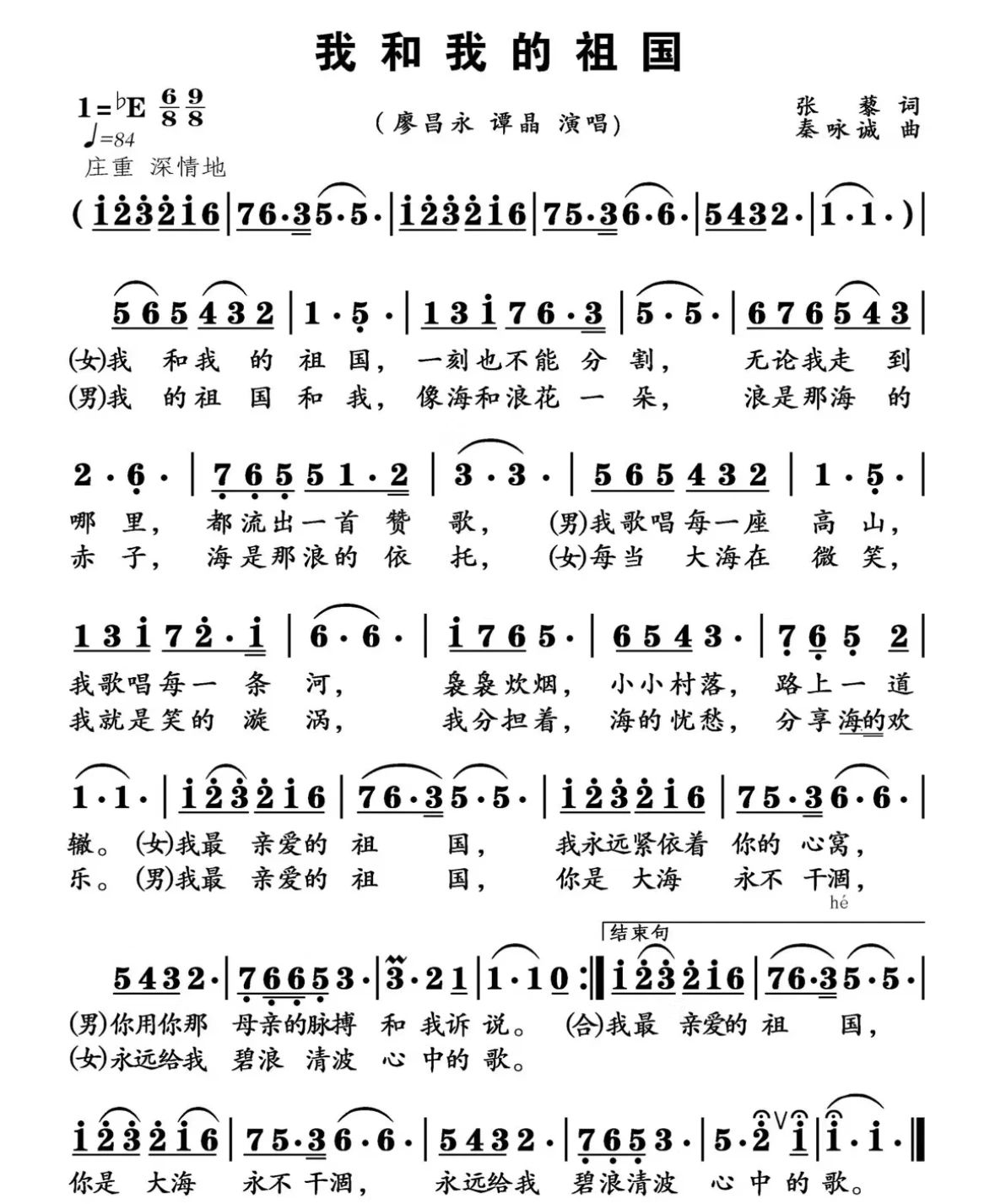 《我和我的祖国》是张藜作词、秦咏诚作曲、黄新国首唱的爱国主义歌曲,于1983年末创作,1984年1月发表于刊物《音乐生活》,李谷一录制的版本流传较广。2019年6月17日,该曲入选中宣部评出的“庆祝中华人民共和国成立70周年优秀歌曲100首”。