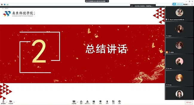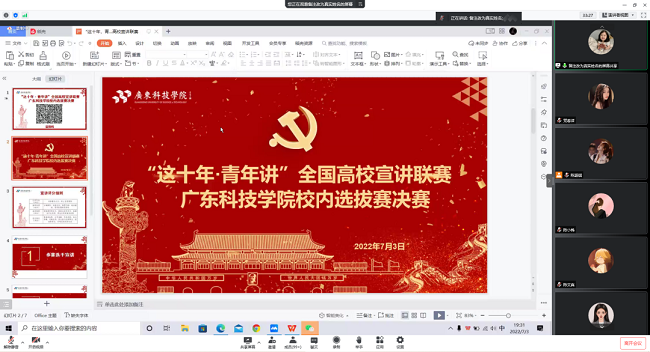 本网讯(党委办公室)为深入学习宣传贯彻习近平新时代中国特色社会主义思想,全面回顾过去十年党带领全国各族人民取得的历史性成就与变革,通过青年宣讲的形式全面回顾过去十年党带领全国各族人民取得的历史性成就与变革,引领广大青年学生以奋发向上的精神状态迎接党的二十大胜利召开,7月3日,由中共广东科技学院委员会办公室、共青团广东科技学院委员会主办,广东科技学院先锋学习会、广东科技学院学生会、广东科技学院大学生“先锋”理论宣讲团承办的“这十年·青年讲”全国高校宣讲联赛广东科技学院校内选拔赛决赛在腾讯会议进行。党委委员、党委办公室主任李赫男、党委办公室组织科副科长高秀婷、党委办公室陆毅、周倩伊作为评委出席比赛。此次“这十年·青年讲”全国高校宣讲联赛比赛由大学生“先锋”理论宣讲团第二负责人胡嘉颖主持,共350余人参加。