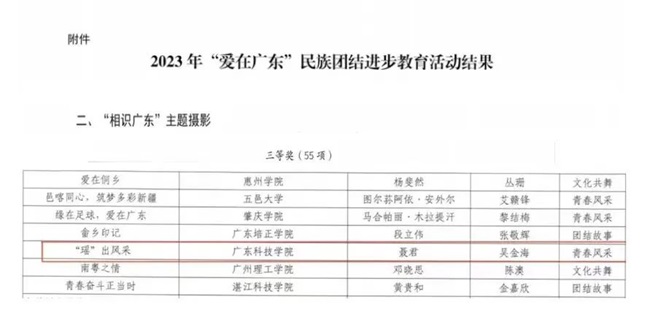 制定《2024年广东科技学院民族团结进步宣传月活动实施方案》,推动学校各级党组织举办多样主题活动28场次。开展2024年"爱在广东"学校民族团结进步教育活动,共征集"相遇广东"主题演讲作品等21件。开展"完善大统战工作格局,为推进中国式现代化的广东实践凝心聚力"主题征文活动,共征集25篇作品。组织参加广东省2024年"读懂中国"活动,荣获征文作品三等奖3项、微视频作品三等奖2项以及舞台剧作品三等奖1项。同时,学校在本次活动评审中荣获"优秀组织奖"。