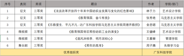 2024年3月起,广东省教育系统关工委以“教育强国,奋斗有我”为主题,在全省高校中全面开展“读懂中国”活动。近日,在广东省教育厅《关于公布2024年开展“读懂中国”活动作品评审结果的通报》中,我校荣获征文作品三等奖3项、微视频作品三等奖2项以及舞台剧作品三等奖1项。同时,我校在本次活动评审中荣获“优秀组织奖”。