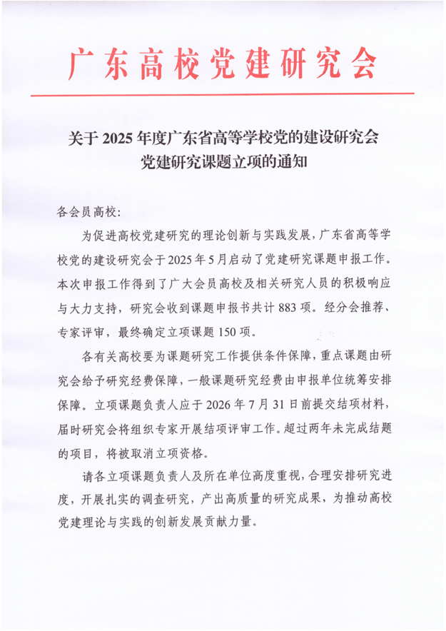 近日,广东省高等学校党的建设研究会公布了党建研究课题立项名单及 “深入贯彻中央八项规定精神学习教育,以作风建设新成效推动高校高质量发展” 主题征文比赛获奖名单。我校在此次评选中成果丰硕,其中徐丹丹负责的“数字赋能高校党建高质量发展研究”课题、袁丹负责的“高校青年教师以及高层次人才党员发展现状及问题研究”课题,双双获批一般课题立项;赖丽珍的征文作品《聆听与传承:从老党员足迹中汲取作风力量》荣获优秀奖。