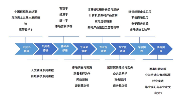 连锁经营企业见习、零售商场见习、电子商务实验、市场调查实验、网络营销实验、商务谈判实验、客户关系管理实验、营销策划实验、网店开设与运营实验、毕业实习与毕业论文(设计)