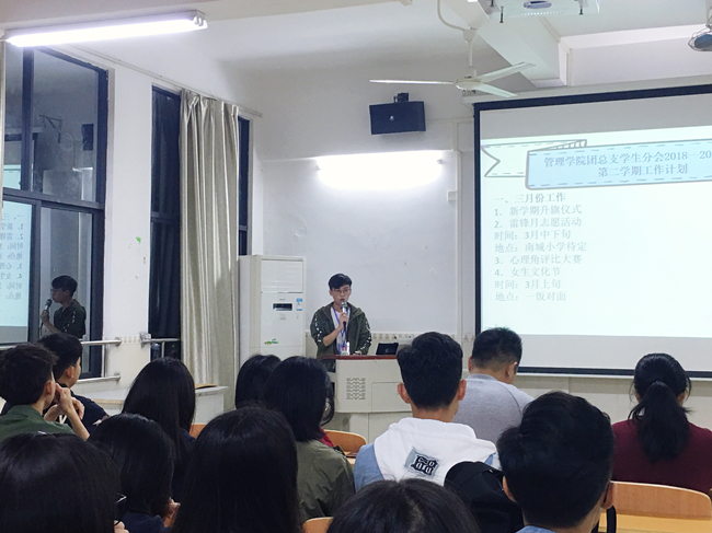 2019年3月3日晚八点四十分,管理学院团总支学生分会新学期干部动员大会在6-601教室召开,出席本次会议的嘉宾有管理学院副院长曾辉玲,管理学院团总支学生分会指导老师刘和平老师和马澄翔老师,以及管理学院团总支学生分会主席团及各学生干部。