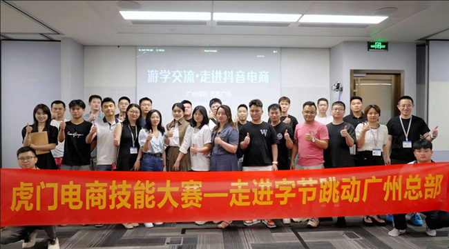 非学无以广才,非志无以成学。为进一步增进管理学院学生对知名企业的了解,提升社会实践能力,进一步加深理论知识与实践的理解与感悟,5月23日,在虎门电商技能大赛的牵头下组织了一场“游学交流-走进抖音电商”企业参访活动,本次参访走进互联网龙头企业字节跳动广州分公司,带队老师是本次大赛负责人跨境电商专业骨干教师向丽梅老师,获奖团队优秀指导老师电商专业伊继伟老师,以及两位优秀学生获奖团队的队长20跨境电商学生陈昭丕和21跨境电商学生刘北星。