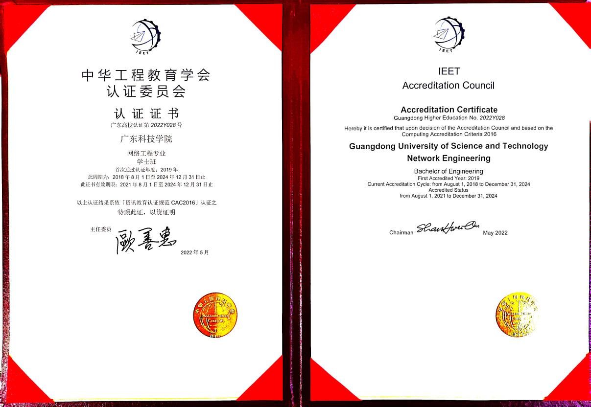 网络工程专业成为华为ICT学院、腾讯云产业学院的依托专业、东莞市鲲鹏计算重点实验室支撑专业;广东省十二五规划项目“与国家职业(行业)标准相衔接的网络工程专业教学体系探索”验收等级为“良好”;通过中华工程教育学会IEET认证;获批教育部协同育人项目5项;获得省级教学成果二等奖1项,获校级教育教学成果特等奖1项、一等奖1项;建设省级一流本科课程1门,省级精品资源共享课程2门;编写出版教材6部;省级校外实践教学基地1个;省级高校工程技术研究(开发)中心1个。