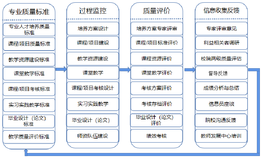 依照网络工程专业教学质量国家标准,结合混合式教学模式和专业建设实际,以结果为导向,以过程管理为手段,形成“质量标准—过程监控—质量评价—反馈改进”闭环的教学质量保障体系。