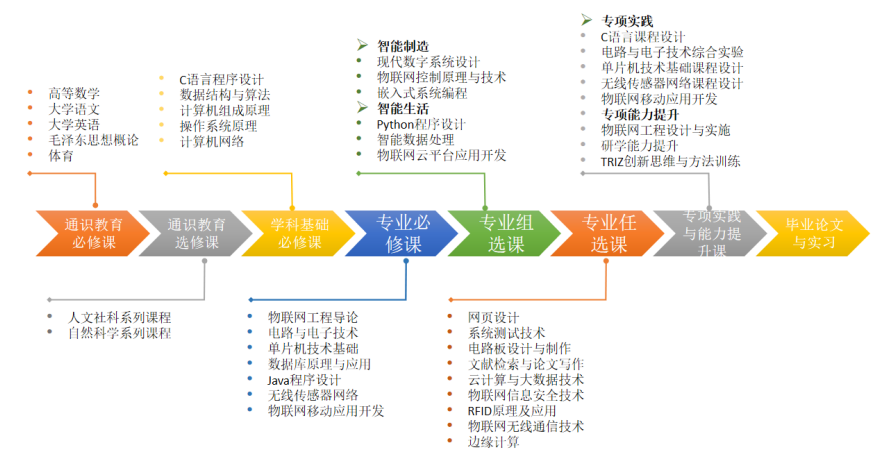 C语言课程设计、电路与电子技术综合实验、数据结构与算法课程设计、数据库原理及应用课程设计、单片机技术课程设计、无线传感器网络课程设计、物联网移动应用开发课程设计、物联网工程设计与实施/学科前沿问题探索/创业实践等。