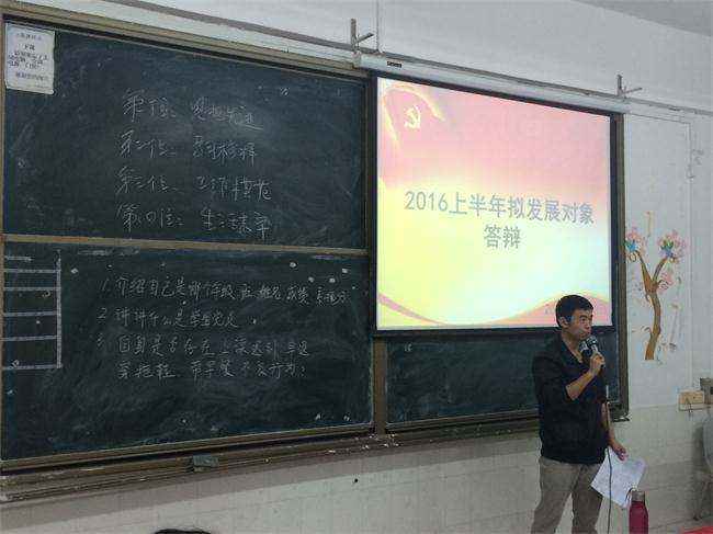 拟发展对象答辩完,曾烽书记总结了这次会议,提出应如何向党组织靠拢的几点建议:首先要思想先进,要认识什么是中国共产党,什么是党员,为什么要入党;二是要成为别人学习的榜样;三是要成为工作模范;四是要做生活表率。从递交入党申请书开始就要做好引领先锋模范作用,要打硬仗和持久战,从身边的小事做起,认识到自己的不足并加以改正,发扬自己的优点。