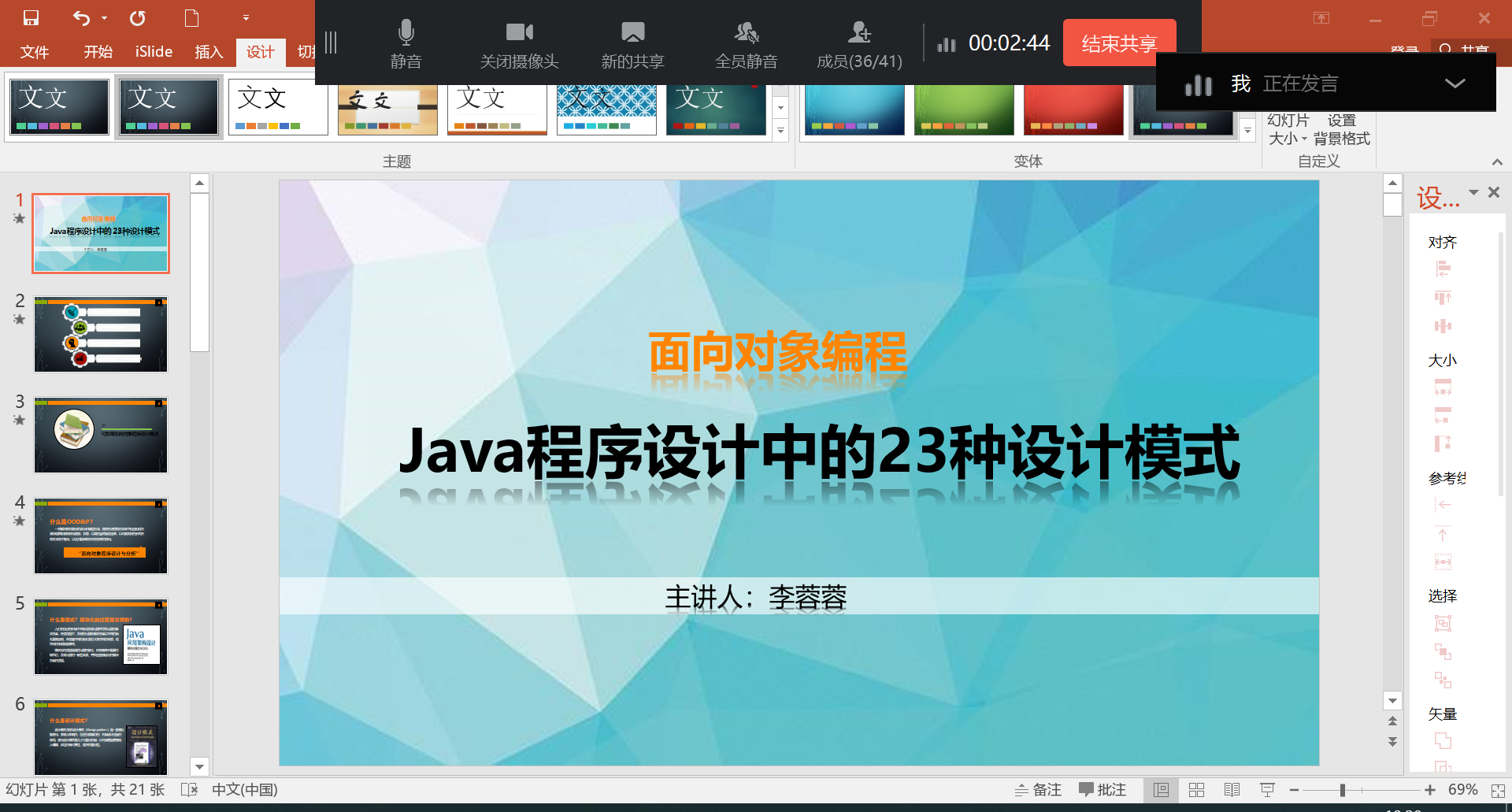 为提高学生Java语言程序设计编程能力,计算机学院李蓉蓉老师在4月15日晚上19:30-20:30,为软件工程专业学生作了一场主题为《Java程序设计中的23种设计模式》的线上专题学术讲座,计算机学院40多名学生积极参与此次讲座。