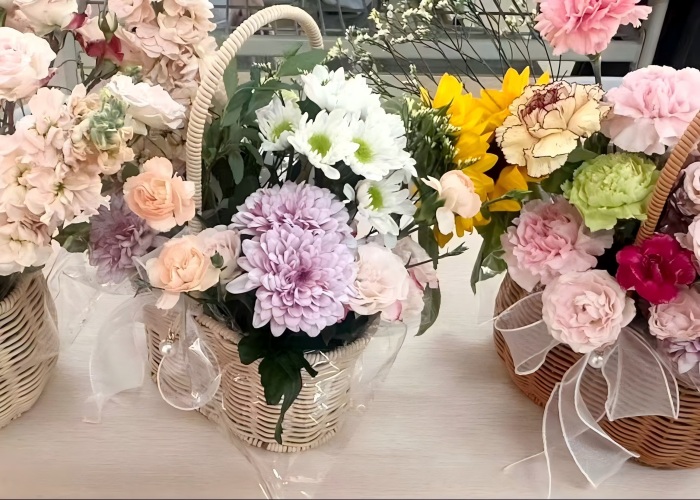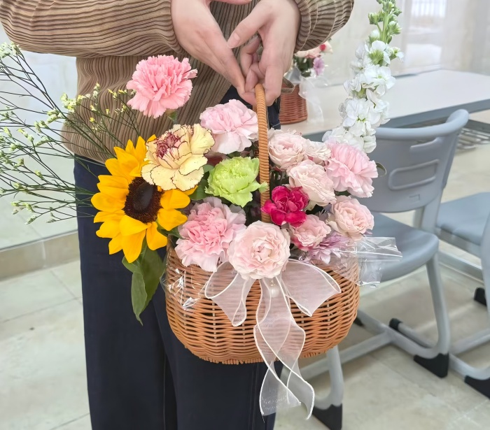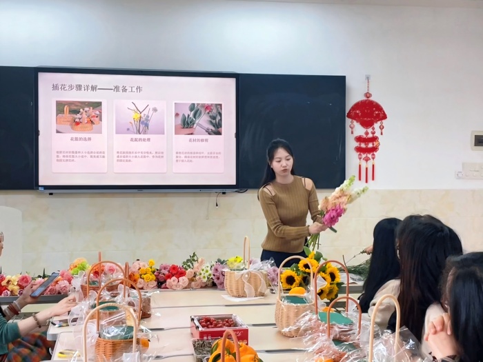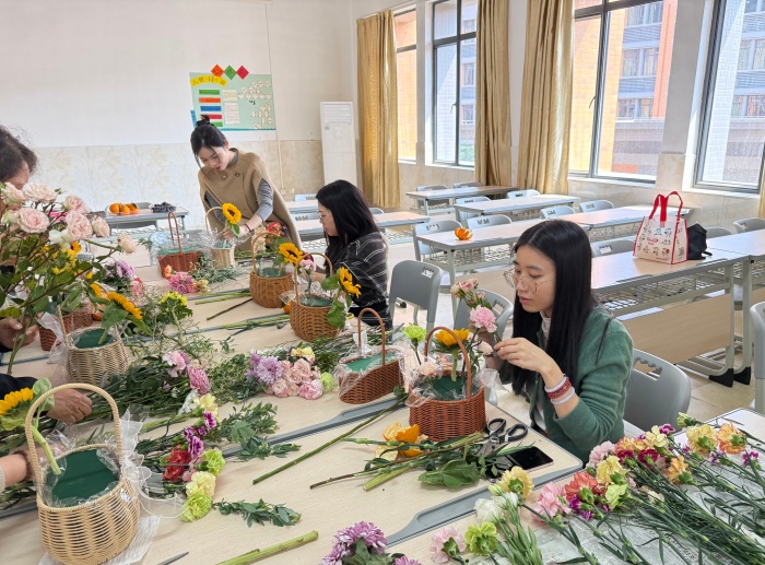活动伊始,现场便被芬芳的花香和轻松的氛围所包围。教研室为大家准备了丰富的花材,有象征热情的玫瑰、寓意高雅的康乃馨、清新淡雅的雏菊以及各类点缀的绿叶植物。教研室主任王雯首先从花卉选择、色彩搭配、花枝修剪、造型设计以及花语寓意等方面进行了详细讲解,并现场演示了插花的步骤和技巧。