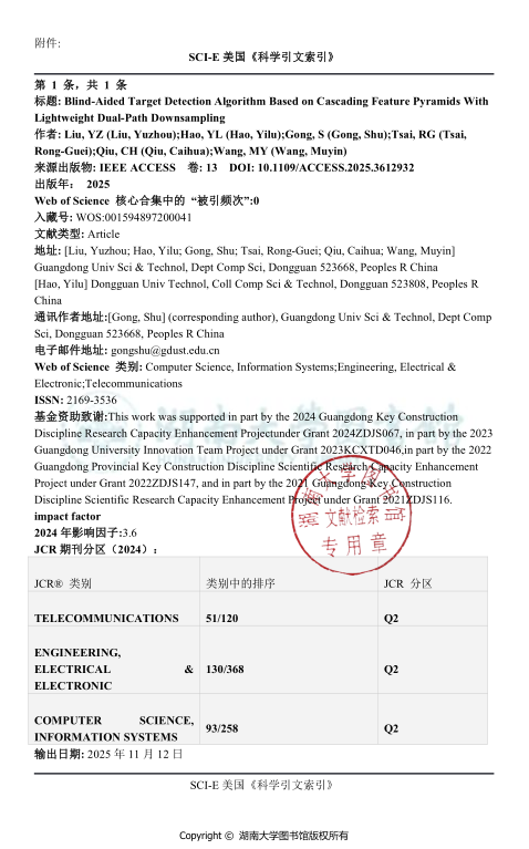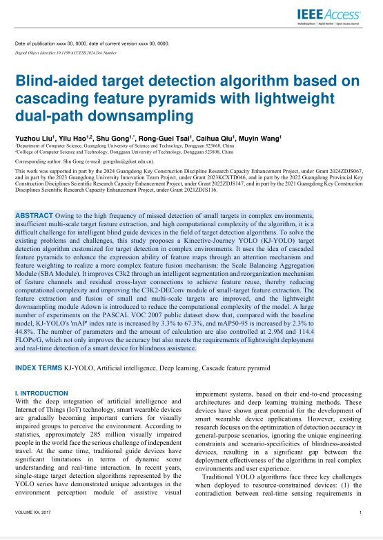 广东省人工智能大语言模型应用创新团队成员、23级本科生刘裕洲同学以第一作者身份,在SCI期刊《IEEE Access》(JCR Q2)上发表了题为《Blind-aided target detection algorithm based on cascading feature pyramids with lightweight dual-path downsampling》的研究论文(已于2025年10月被SCIE/EI检索)。该生提出的KJ-YOLO算法通过级联特征金字塔、注意力机制构建尺度平衡聚合模块,并改进特征复用结构与轻量下采样设计,提升了小目标检测性能(mAP达67.3%)并实现轻量化(参数量2.9M),满足了智能导盲设备对高精度、低计算负担的实时检测需求。