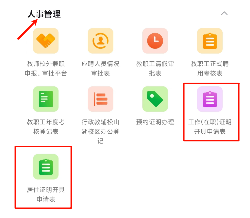 教职工:工作证明、居住证明(★★需钉钉中申请,通过后显示具体内容★★具体位置:钉钉-办事大厅-人事管理)