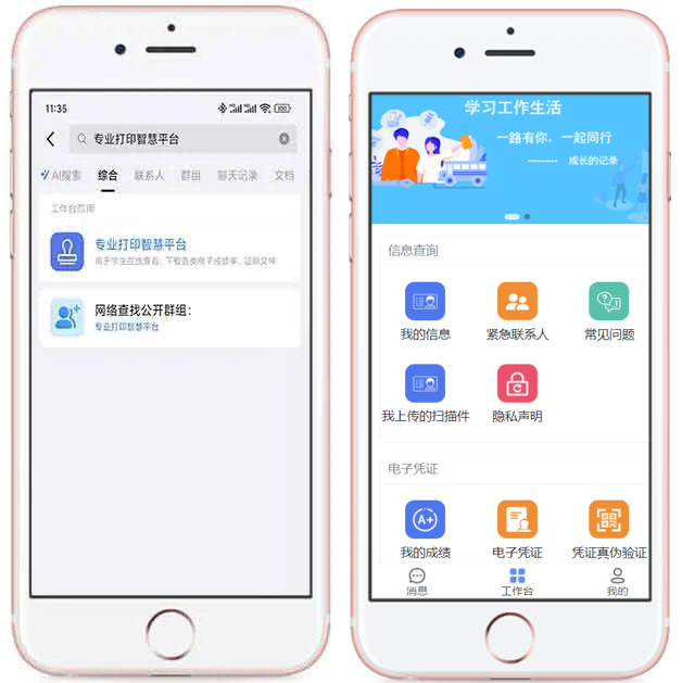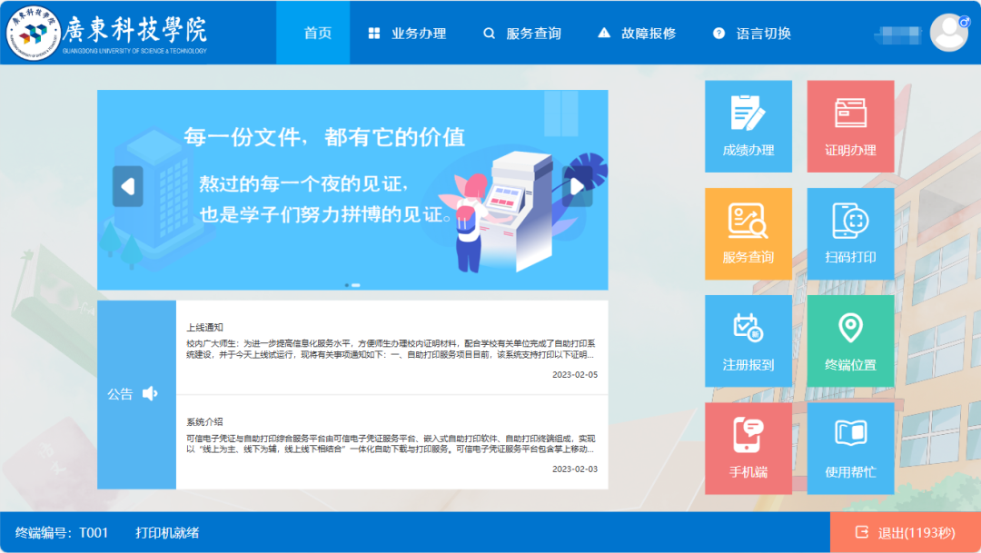 为推动学校信息化建设提供更方便、高效的教学管理服务,方便师生一站式办理各类证明文件需求,学校开展了专业打印智慧平台建设。可通过3种方式——手机端、电脑端和线下自助终端,获取各类成绩单、证明文件等。