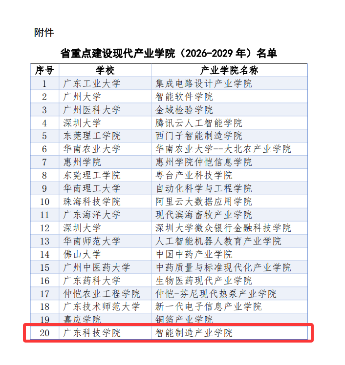 我校智能制造产业学院获批“广东省重点建设现代产业学院”,是学校继“华为ICT学院”、“腾讯云产业学院”后的第三个所省级重点建设现代产业学院。