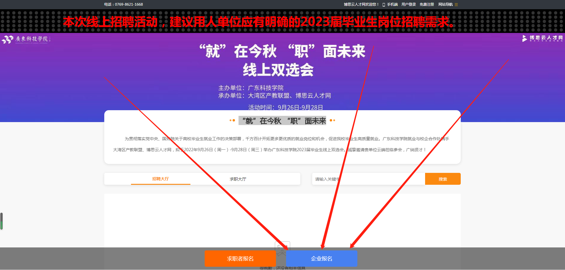 衷心感谢贵单位对广东科技学院毕业生就业工作的大力支持!为贯彻落实党中央、国务院关于高校毕业生就业工作的决策部署,千方百计开拓更多更优质的就业岗位和机会,促进我校毕业生高质量就业。广东科技学院就业与校企合作处携手大湾区产教联盟、博思云人才网,拟于2022年9月26日(周一)-9月28日(周三)举办广东科技学院2023届毕业生线上双选会。诚挚邀请贵单位云端莅临参会,广纳贤才!