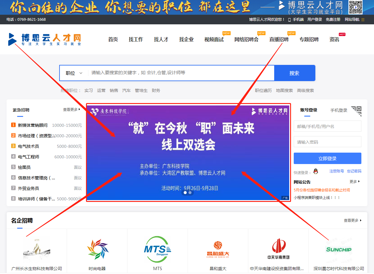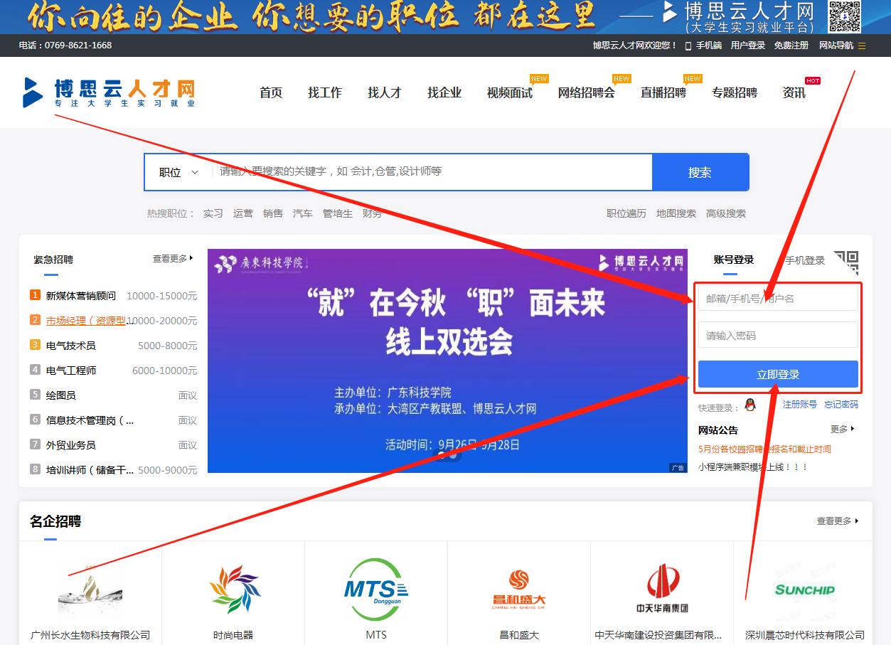 1.PC端电脑浏览器输入“https://www.bossyun.com/”打开博思云人才网,在页面右边依次输入账号密码登录。(忘记密码可通过手机号和邮箱接收验证码重置,或致电0769-86211668重置)