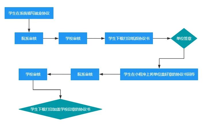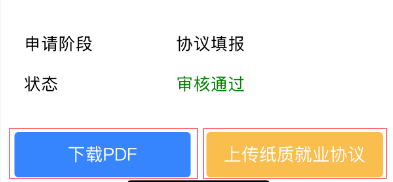 第四步:协议填报审核完成后,学生自行下载电子就业协议书、打印签字后,拿到用人单位进行盖章,用手机将已经签字盖章的就业协议书拍照回传到小程序,等待院级校级进行审核。