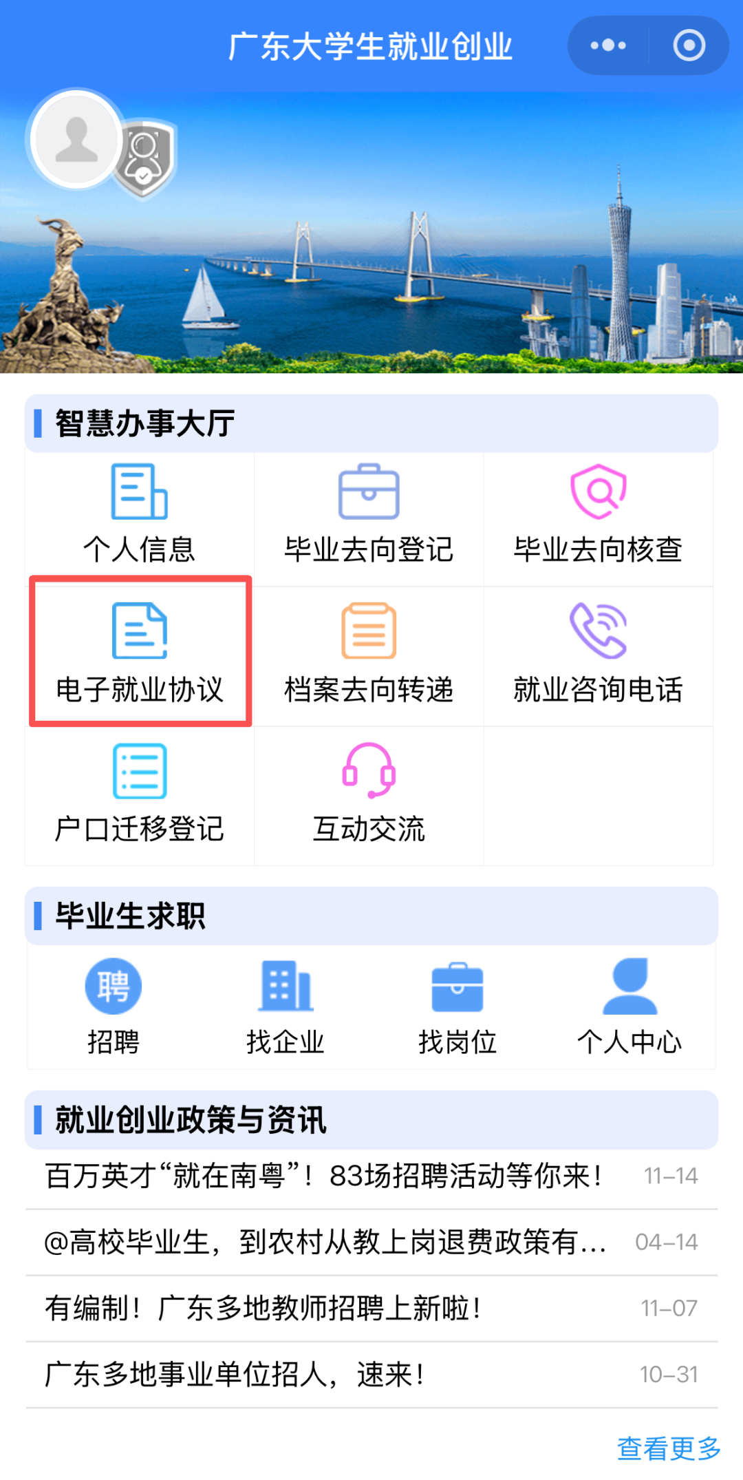 为方便2026届毕业生求职签约,即日起已与用人单位达成签约共识的毕业生可登录“广东省大学生就业创业”官方小程序进行电子就业协议书申请操作。