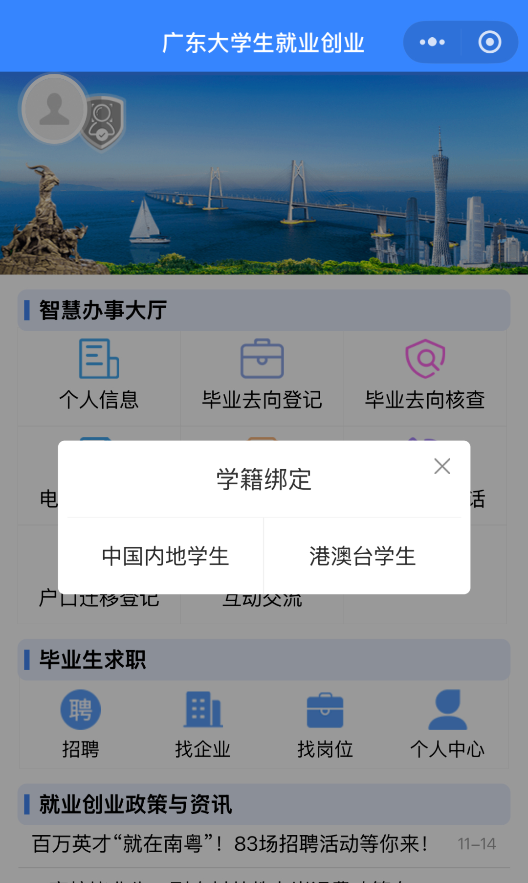 第一步:微信搜索“广东大学生就业创业”官方小程序并点击进入。