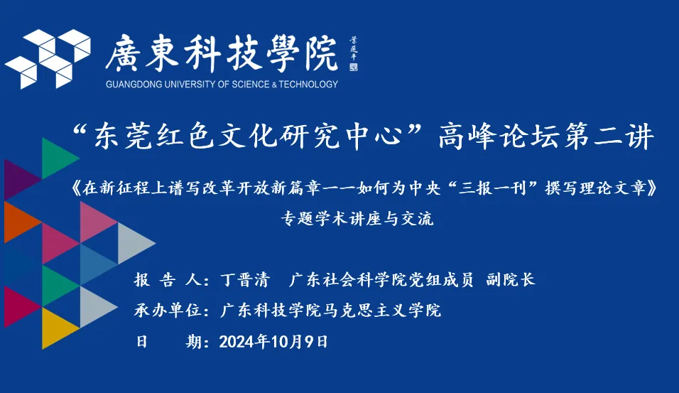 10月9日下午,马克思主义学院在松山湖校区5-301举办“在新征程上谱写改革开放新篇章——学习贯彻党的二十届三中全会精神”系列活动暨“东莞红色文化研究中心”高峰论坛第二讲。广东省社会科学院党组成员、副院长丁晋清研究员受邀作《党的创新理论研究阐释的方法论探究——如何为中央“三报一刊”撰写理论文章》的专题讲座。讲座由马克思主义学院副院长、东莞红色文化研究中心主任王斌主持,林艳院长、全院师生参加。