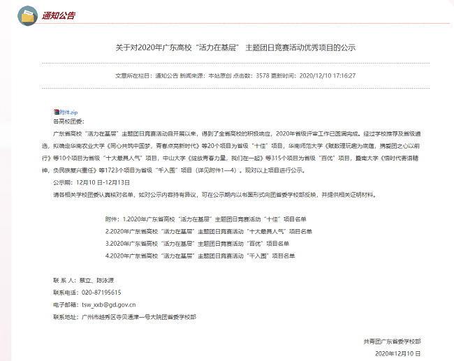 本网讯(青年传媒中心)日前,2020年广东省高校“活力在基层”主题团日竞赛活动省级评审工作已圆满完成,活动自开展以来,我校积极响应。经我校推荐并经省级遴选,共有20个项目荣获“千入围”项目,其中3个“活力在基层”项目荣获“百优”项目。