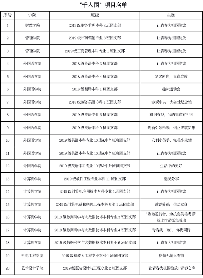 我校20个团支部入围“千优”项目名单,其中财经学院入围1个团支部,管理学院入围2个团支部,外国语学院入围9个团支部,机电工程学院入围1个团支部,艺术设计学院1个团支部,计算机学院6个团支部。