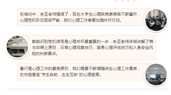 12月1日下午,朱亚老师为全体朋辈成员开展了大学生心理危机识别、预警和关怀的专业培训。其中令人感悟最深的一句话是:生命至上原则,树立生命关怀意识必不可少。
